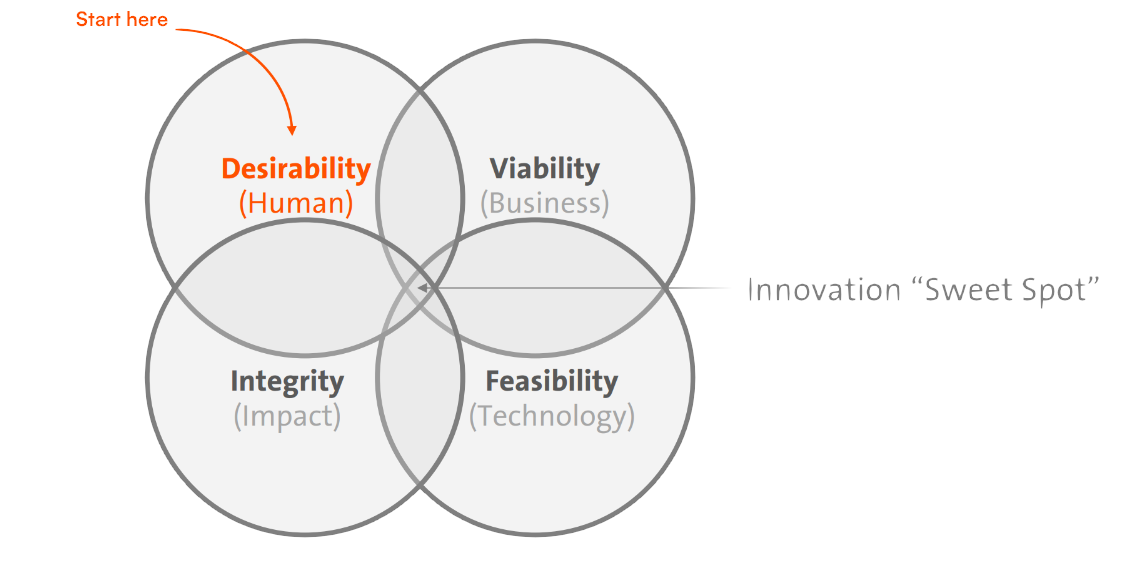 We tried to review all the aspects that come into play when we think about a strategic innovation, and that's the sweet spot between desirability, viability, feasability, and impact.
